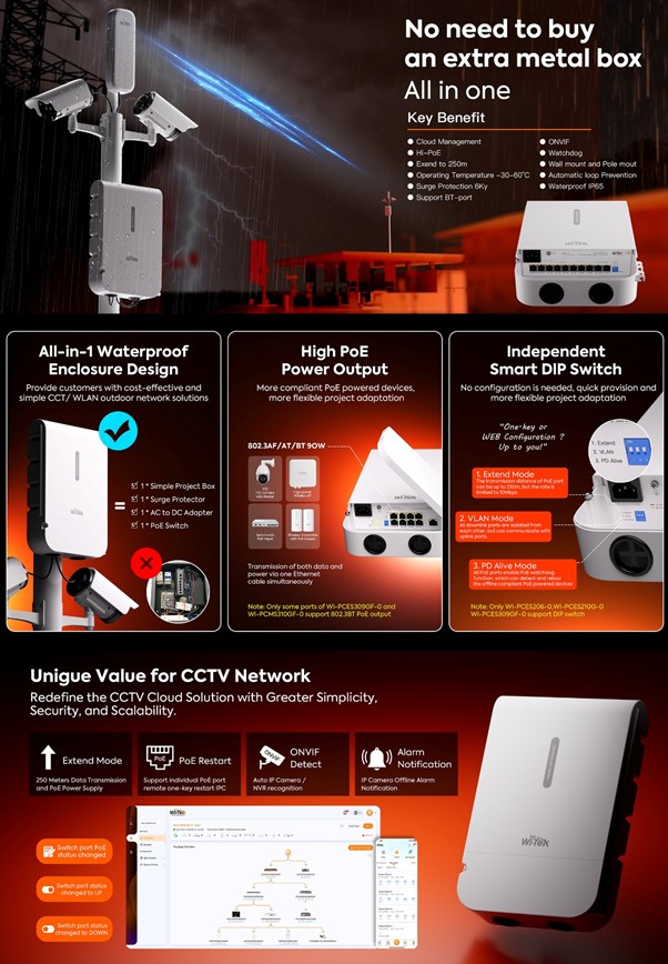 In pratica, i quattro modelli non vanno letti come semplici varianti dello stesso prodotto. WI-PCES206-O e WI-PCES210G-O sono switch outdoor Easy Smart pensati per impianti CCTV snelli, con funzioni immediate come Extend, VLAN e PD Alive. WI-PCES309GF-O aggiunge porte Gigabit, uplink in fibra e 90W sulle prime due porte, quindi si presta meglio a telecamere PTZ, access point outdoor e collegamenti più esigenti. WI-PCMS310GF-O gioca invece in un’altra categoria: mantiene il formato outdoor integrato, ma aggiunge un profilo L2+ gestito, due uplink SFP e funzioni avanzate adatte a impianti più strutturati.